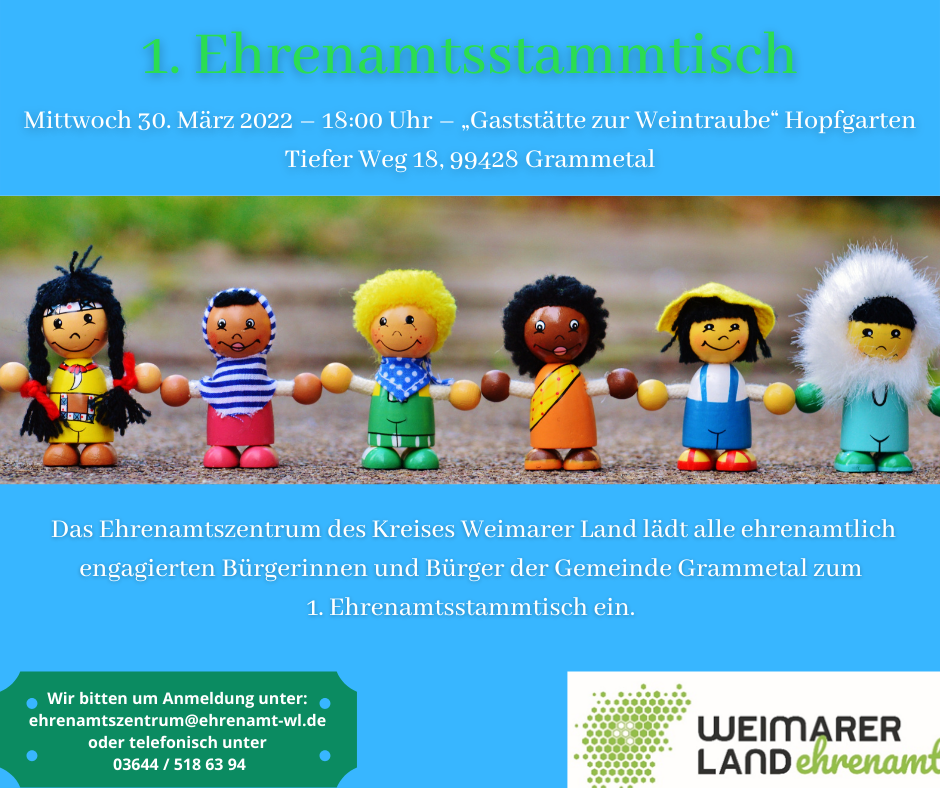 Das Ehrenamtszentrum des Landkreises Weimarer Land lädt am 30.03.22 um 18 Uhr in die Gaststätte "Zur Weintraube" in Hopfgarten ein. Als Dorfkümmerer-Koordinator und Gemeinderat möchte ich alle Grammetaler Vereine und ehrenamtlich Engagierte dazu motivieren, an dieser Veranstaltung teilzunehmen. Nach der Corona-Pandemie ist jetzt der richtige Zeitpunkt, wie wir kraftvoll wieder ins Dorfleben zurückkehren können. Dafür braucht es vernetzte Vereine, die gut zusammenarbeiten. Ich würde mich freuen, möglichst viele von Euch dort persönlich zu treffen.